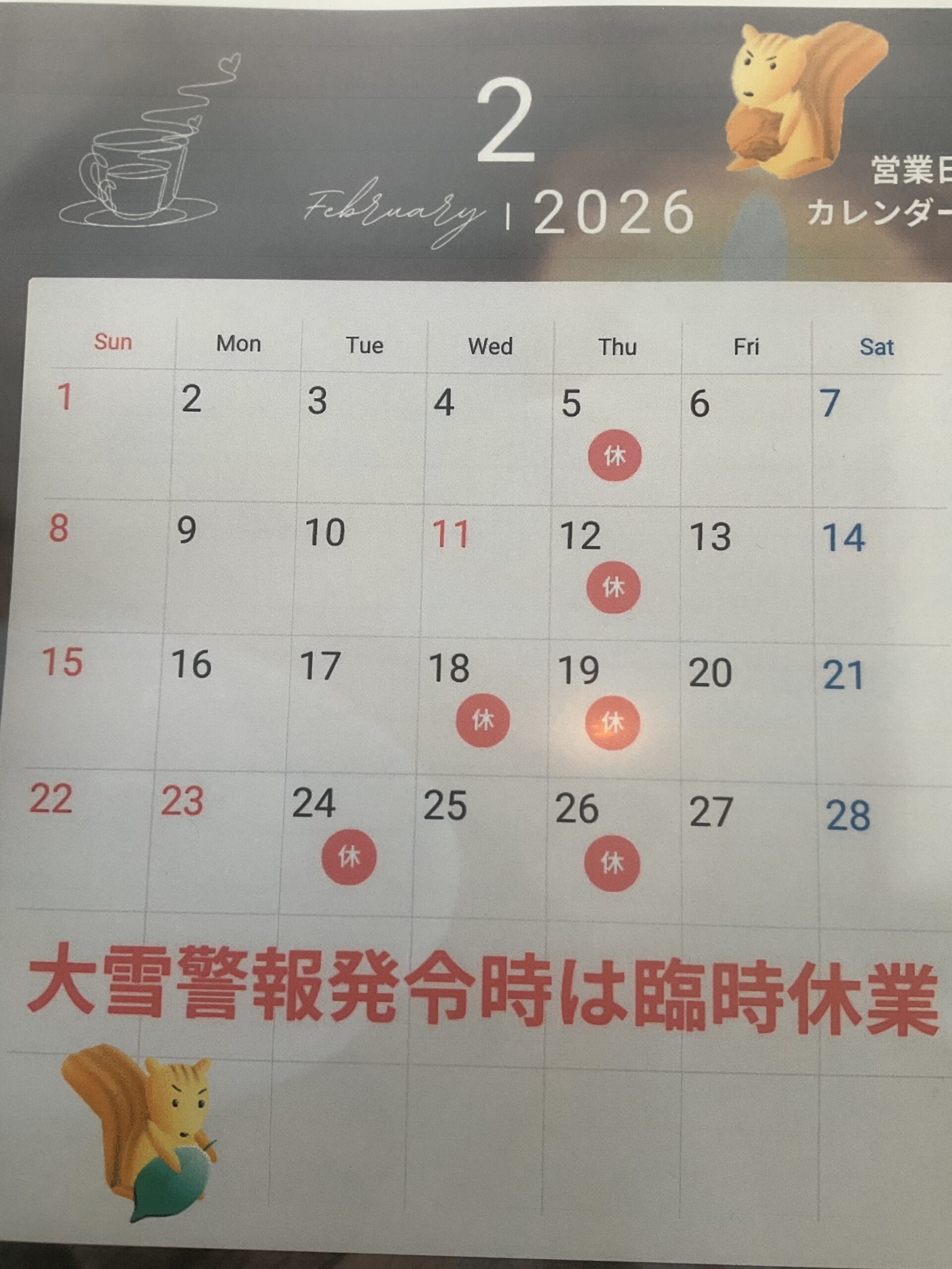 2026.2.3更新 2月のお休み 木曜日の定休日に加えて 2/18、24 お休みいたします 商品のご予約、詰め合わせをご希望の方は時間にゆとりを持って店主に相談して下さい ※10:00〜17:00売り切れ次第閉店 ※木曜定休